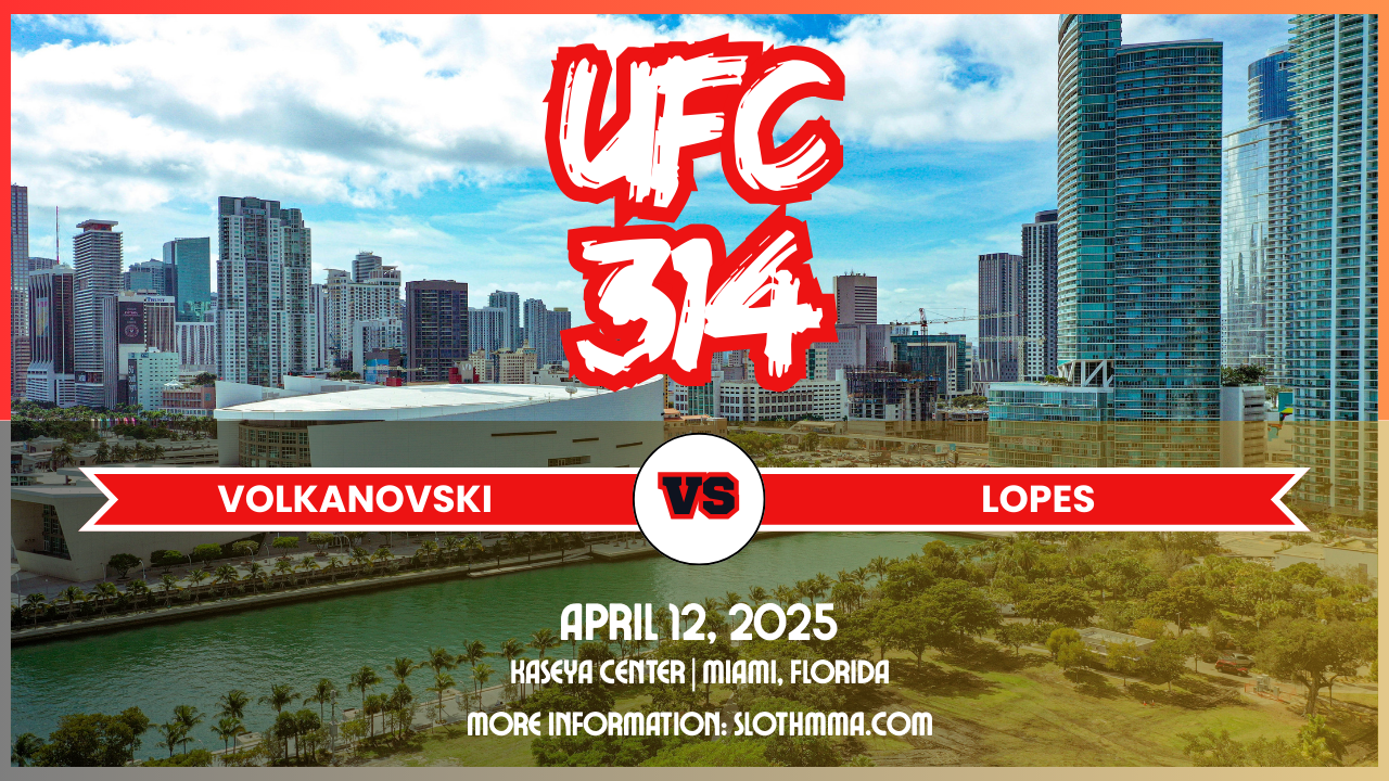 UFC 314: Volkanovski vs Lopes took place at the Kaseya Center in Miami, Florida on April 12, 2025.